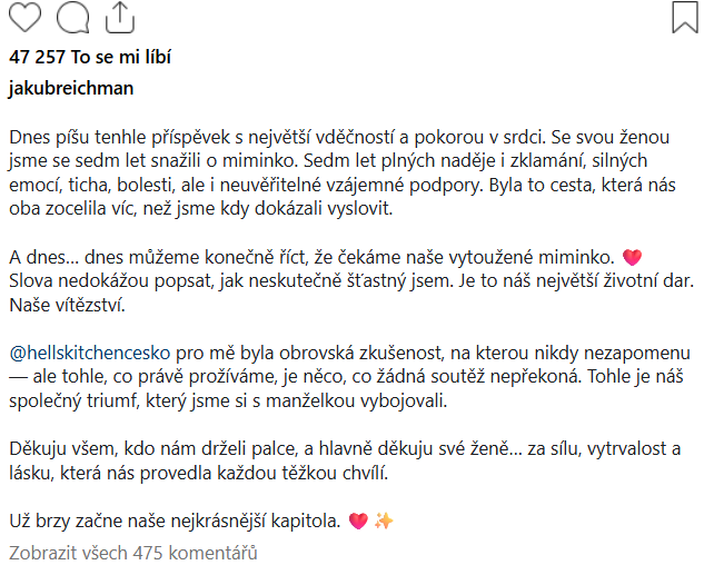 A pokud je pravda, že v kuchyni bojuje srdcem, dalo by se říct, že to největší vítězství si odnáší mimo soutěž – domů, kde za pár měsíců přivítá své vytoužené dítě.