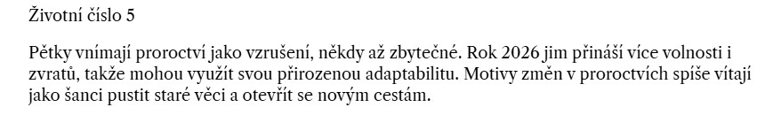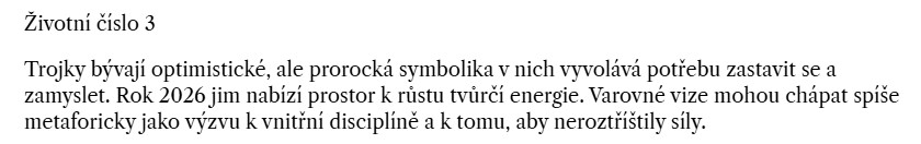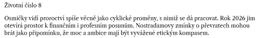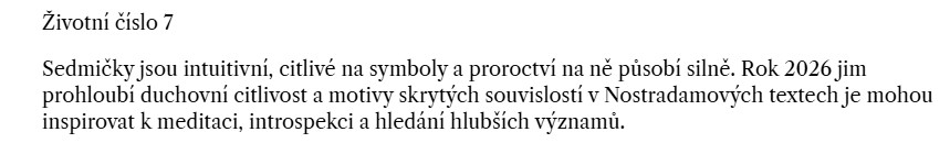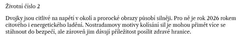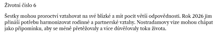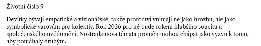Nostradamova předpověď pro rok 2026, rok zralosti. Dvojkám zamíchá v citech, osmičky získají bohatství. Na co se připravit podle vašeho životního čísla? Od A S 146 Sdílejte Facebook Příklad:12. 8. 1984→ 1+2+8+1+9+8+4 = 33→ 3+3 = 6Životní číslo: 6 Na co se připravit v roce 2026 podle vašeho životního čísla?